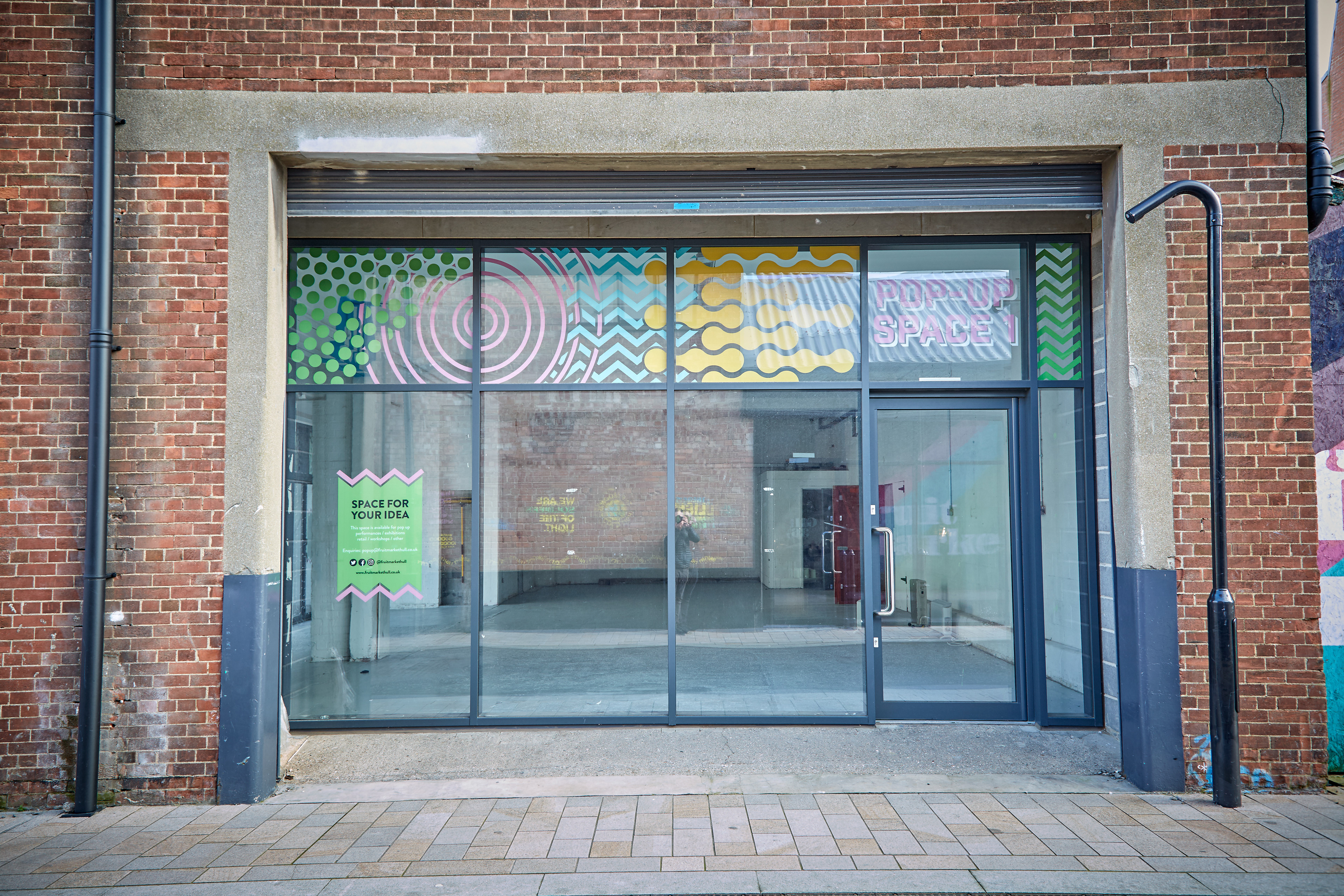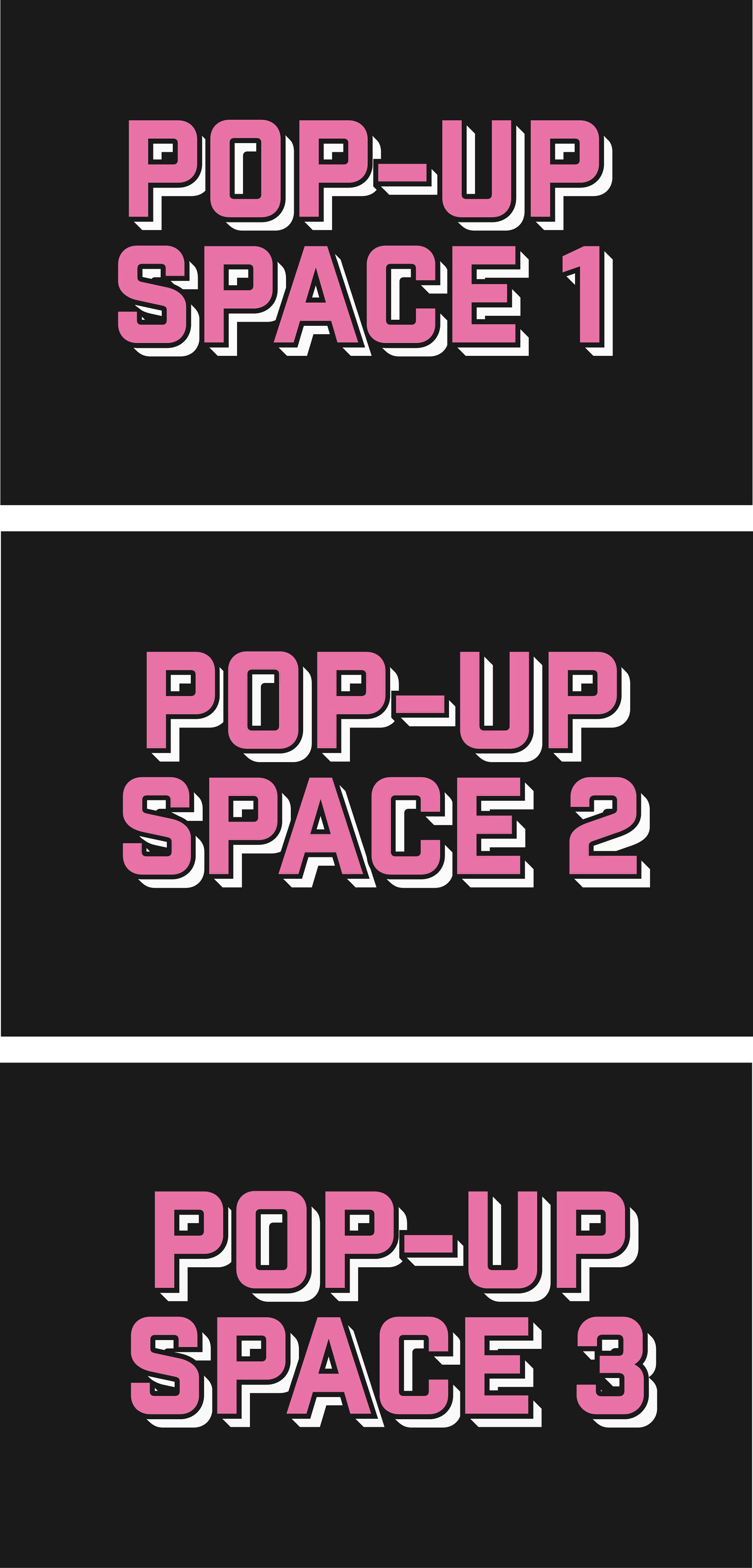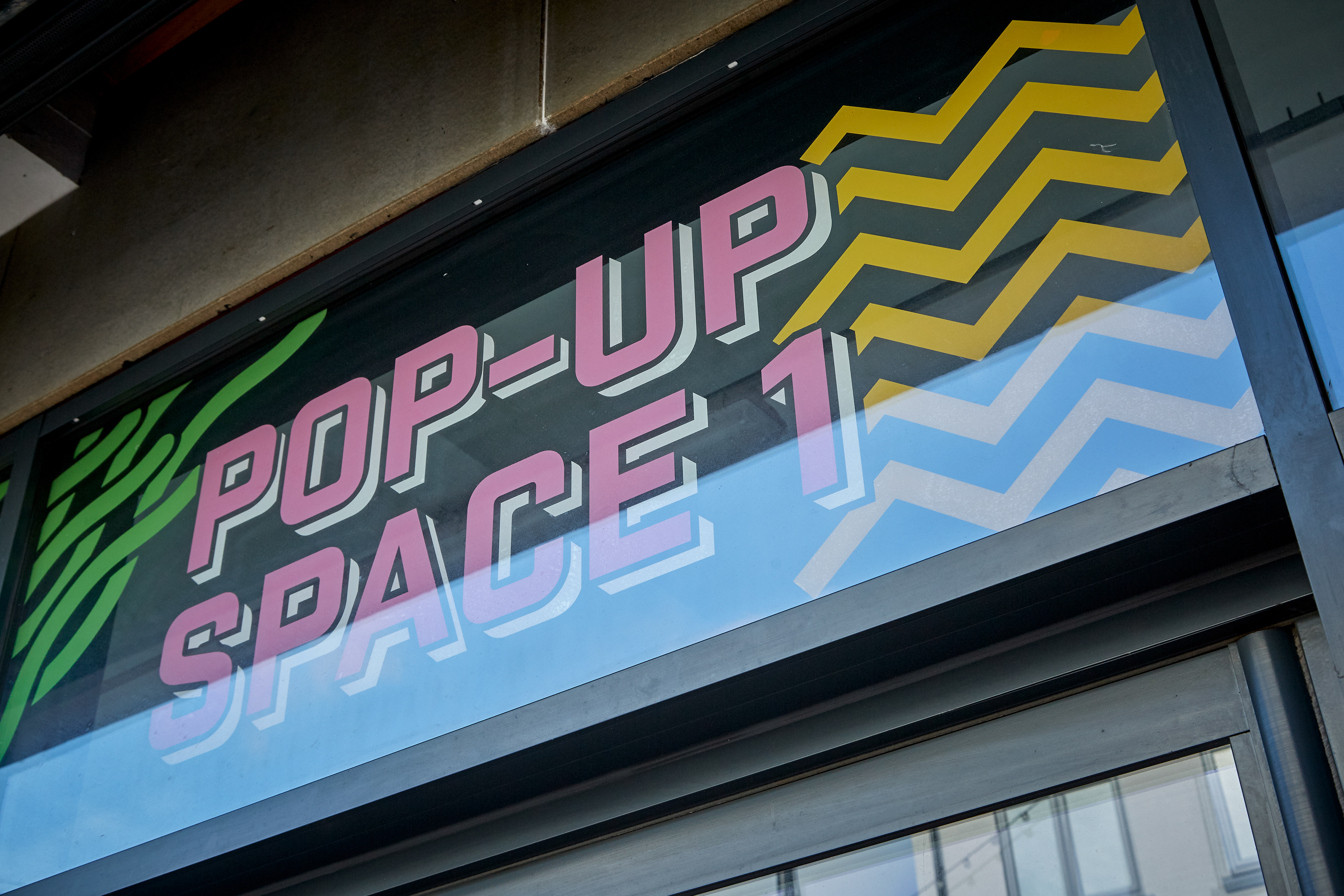 The pop-ups needed a consistent look across the three spaces but something didn't want to detract from whatever event was happening within the space. So each was branded up with the same abstract graphics along the top window panels of the units. Keeping them bright and eye-catching with enough space for a user to assert their own personality in the windows below.