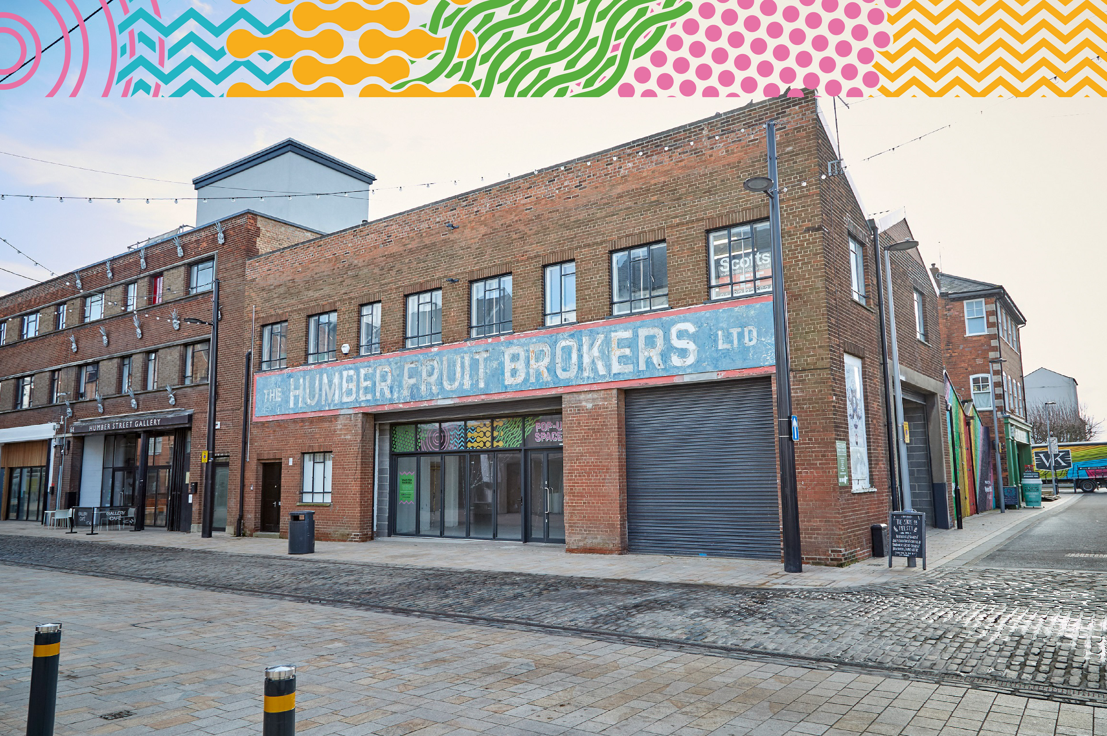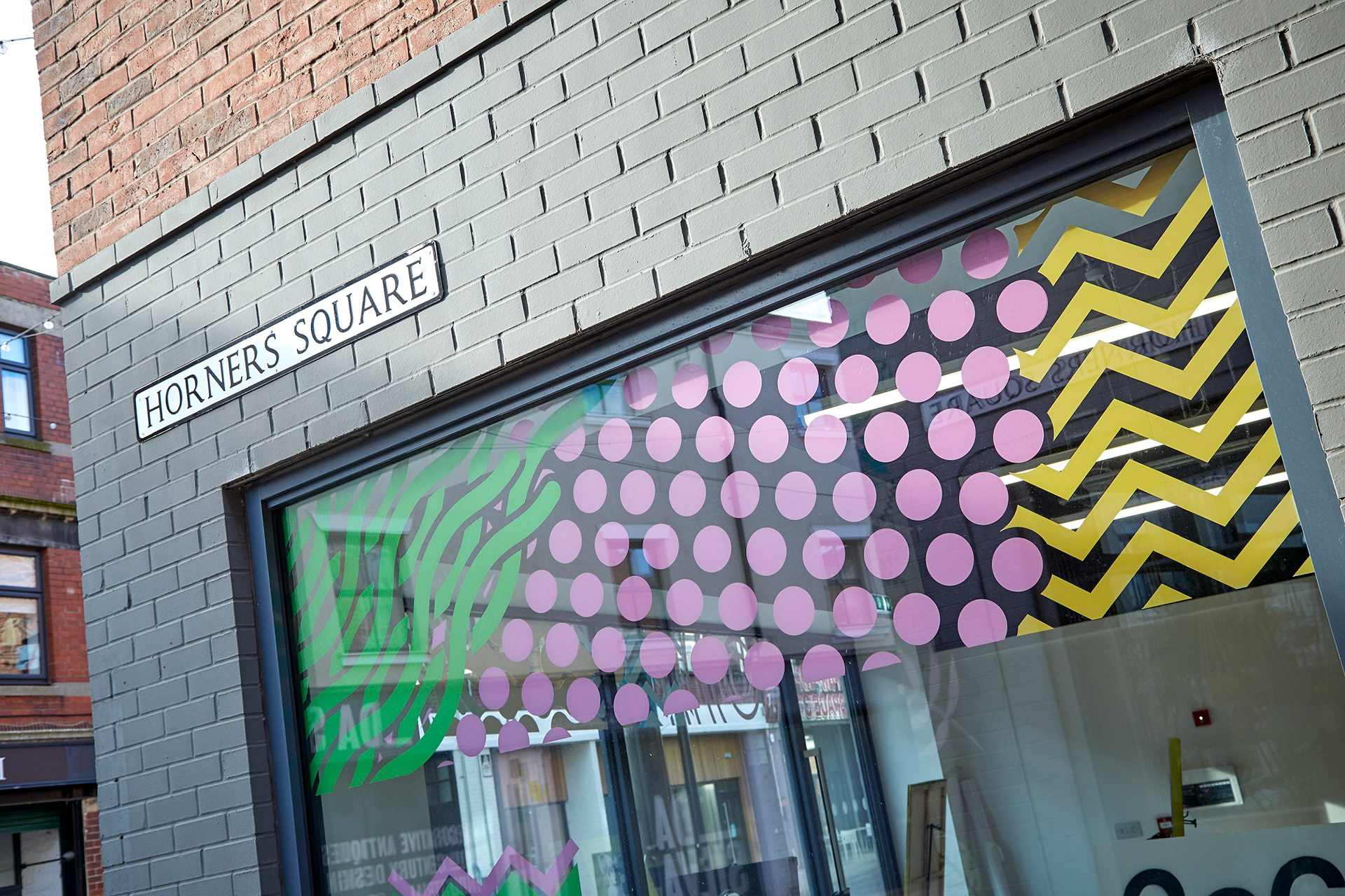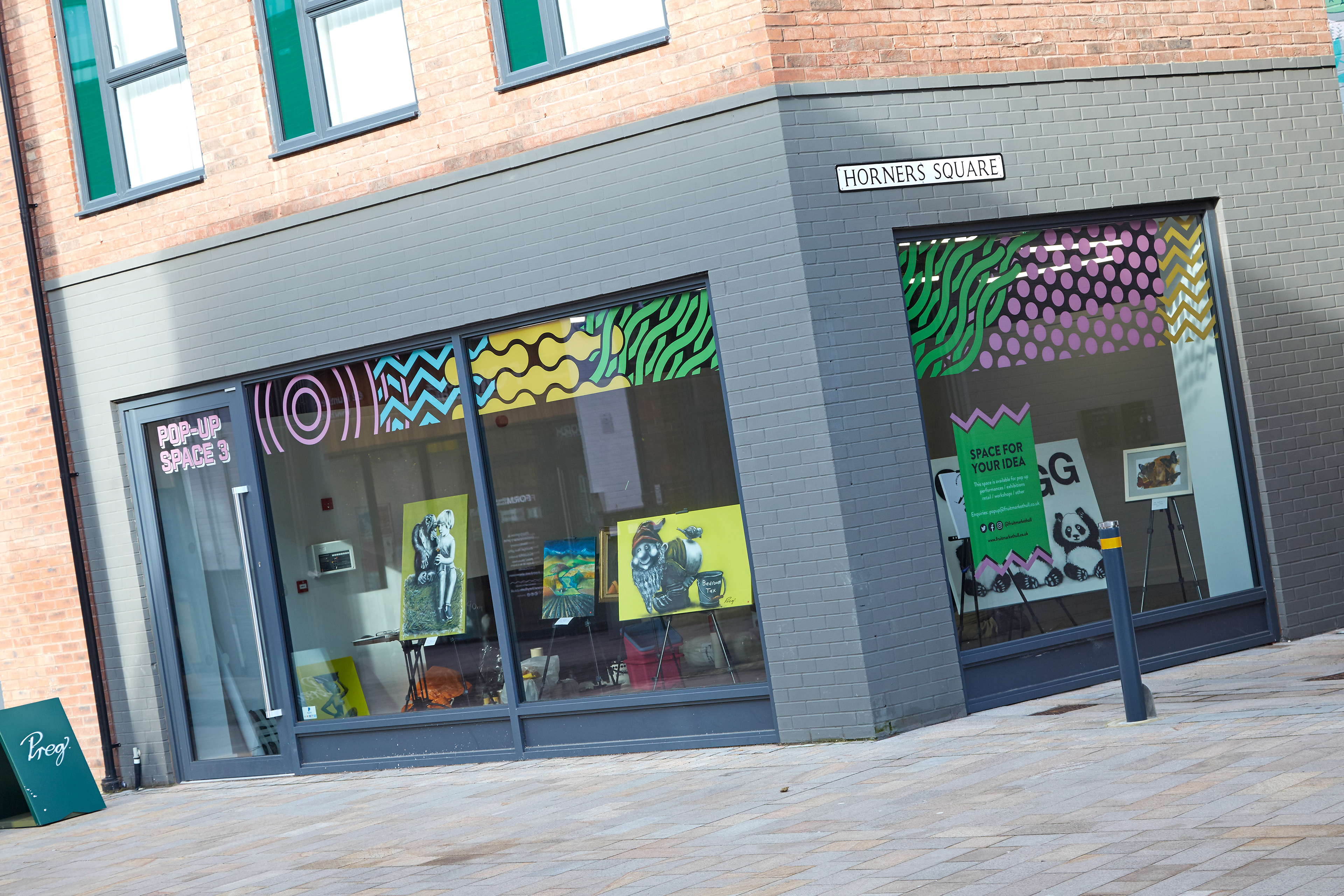 The pop-ups needed a consistent look across the three spaces but something didn't want to detract from whatever event was happening within the space. So each was branded up with the same abstract graphics along the top window panels of the units. Keeping them bright and eye-catching with enough space for a user to assert their own personality in the windows below.