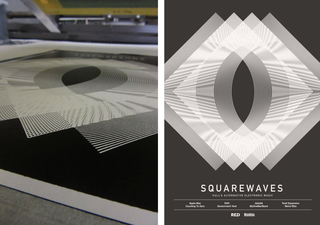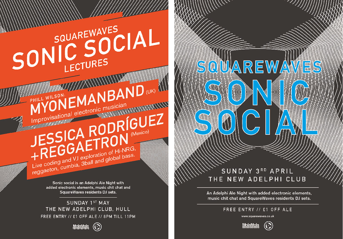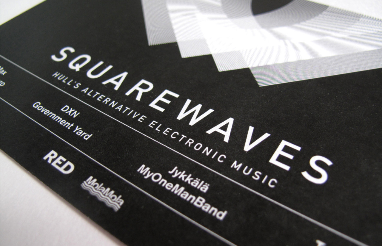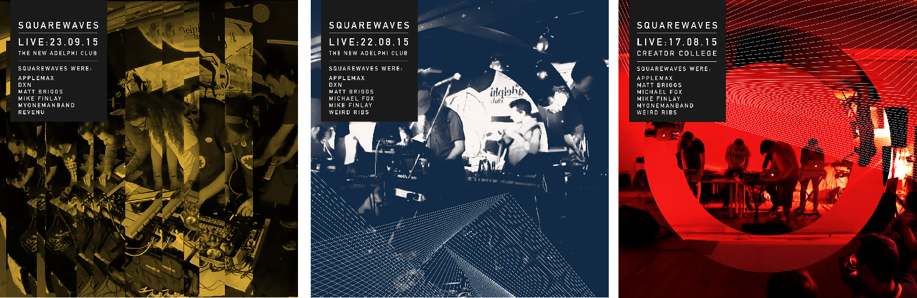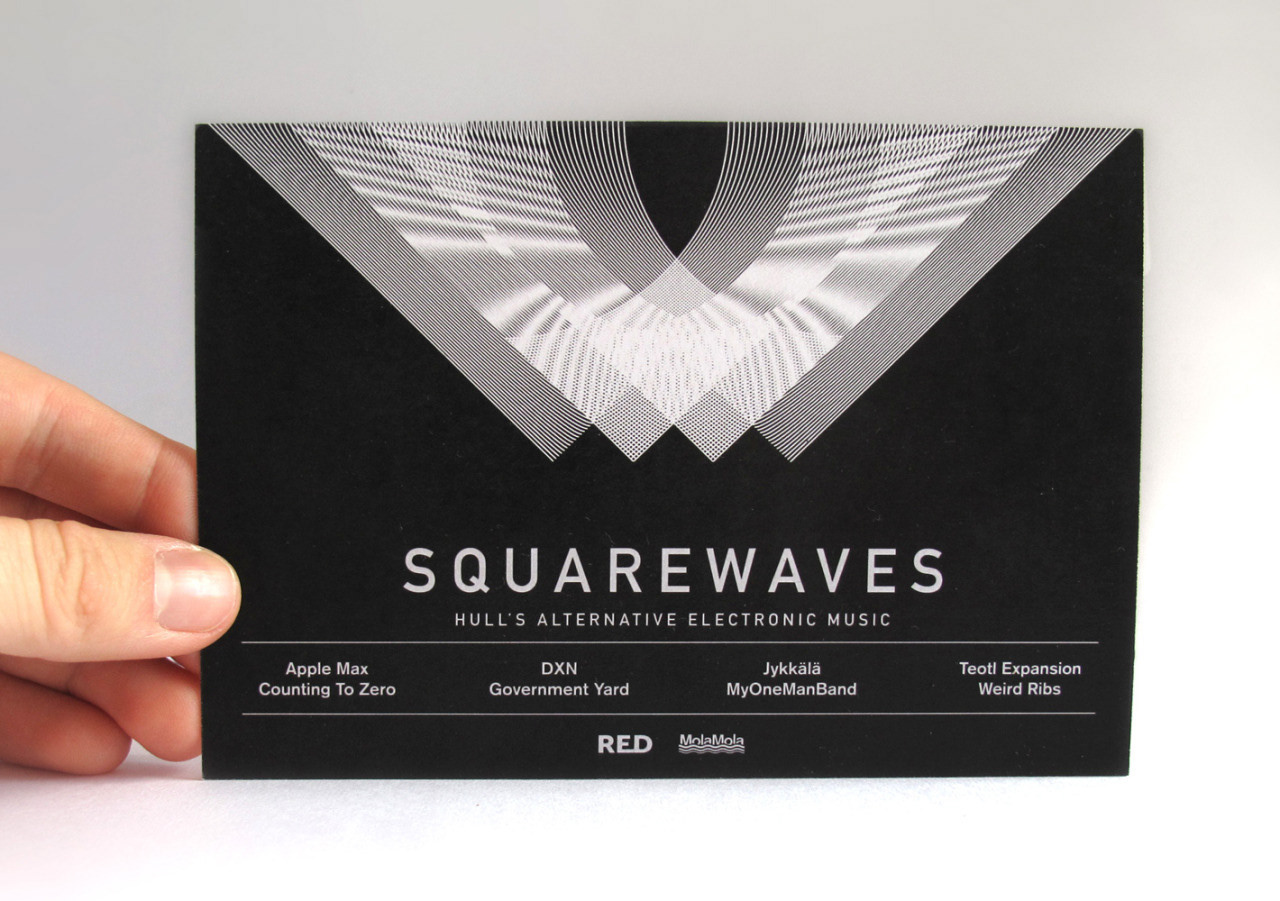 A mix of design created for Hull based electronic collective SquareWaves. Originally design for a compilation CD with insert design, plus screenprinted posters and postcards. But has since grown to include more live CDs, event posters and web graphics.