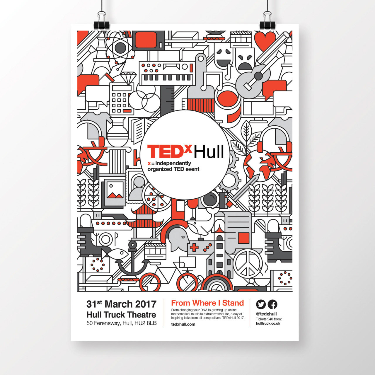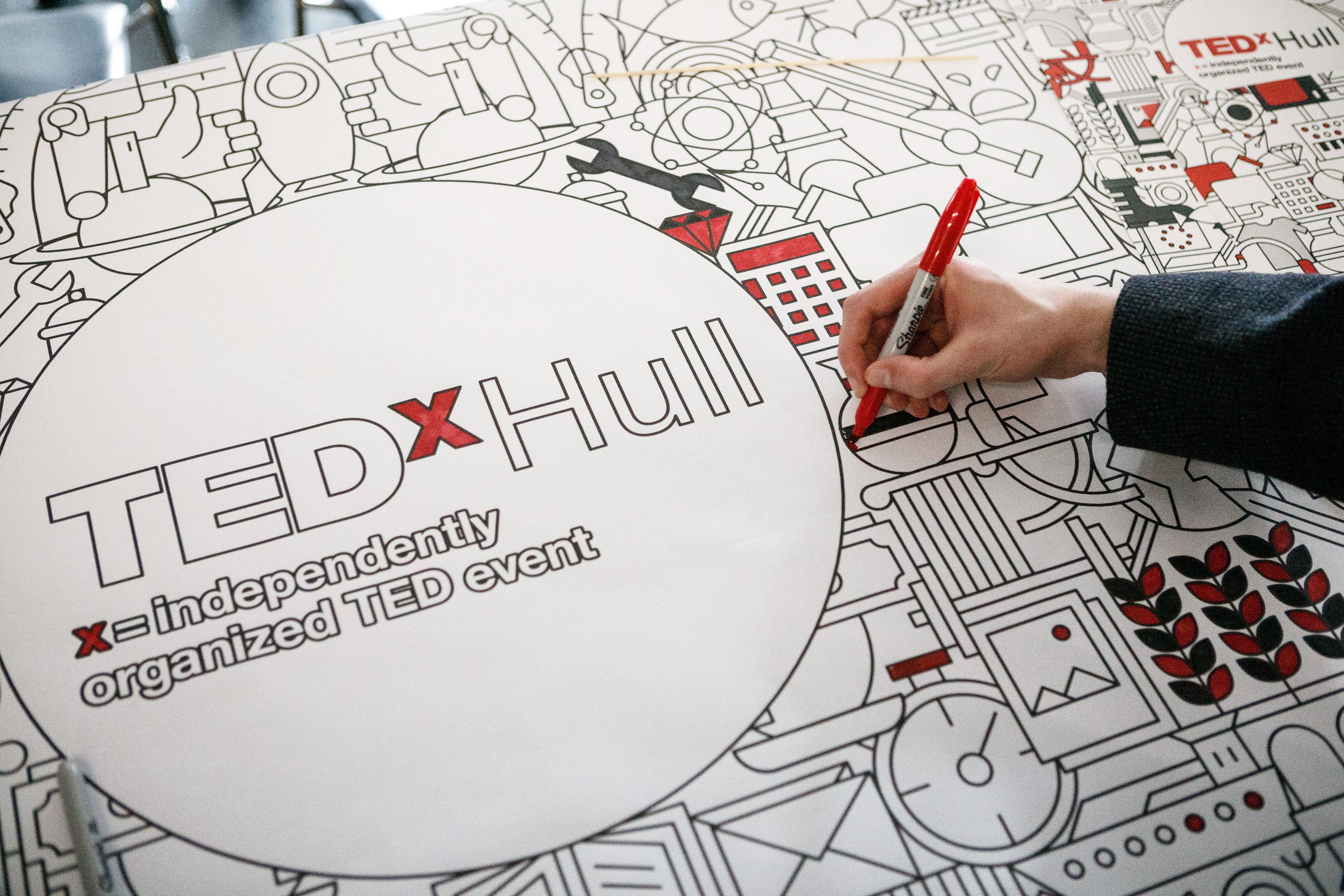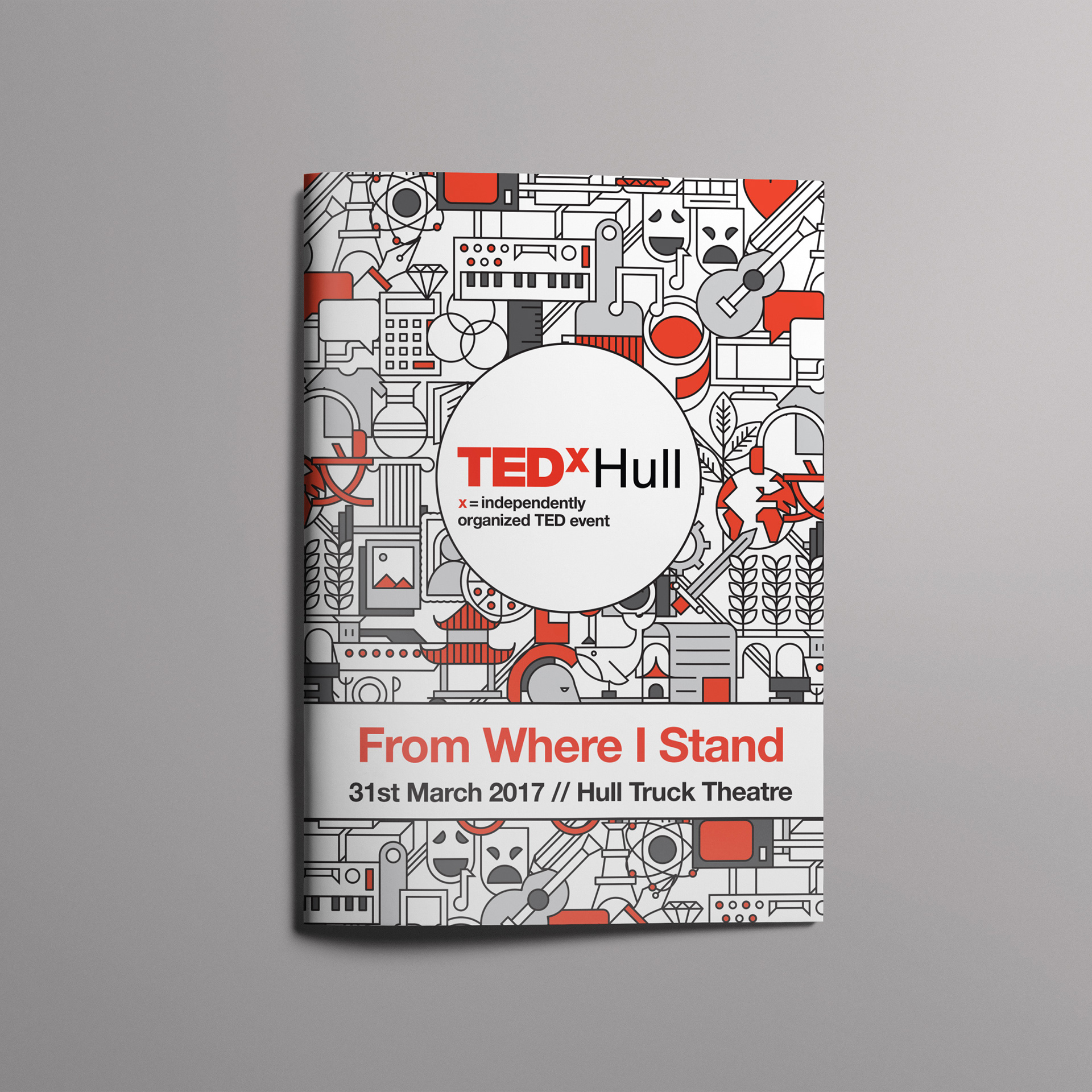 Design for the 2017 TEDxHull event, including illustrated poster, programme, PPT slides and a giant colouring in sheet of the artwork. Photographs by Mark Kensett Photography.