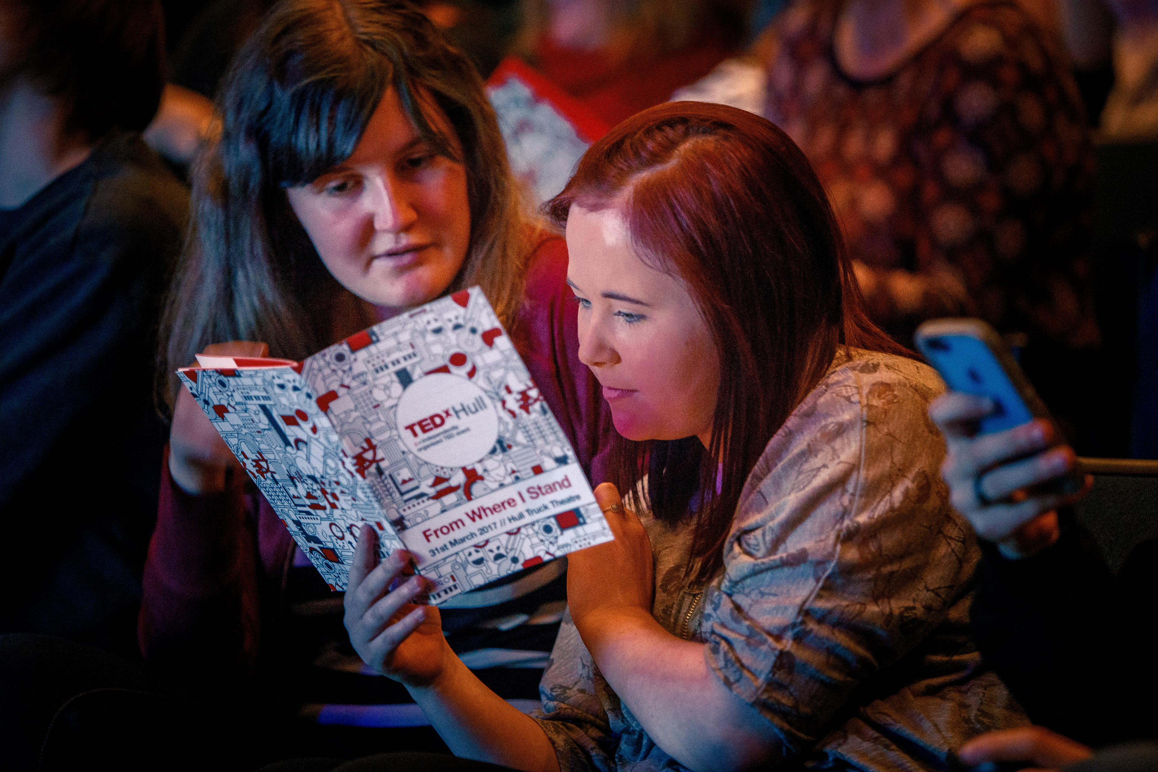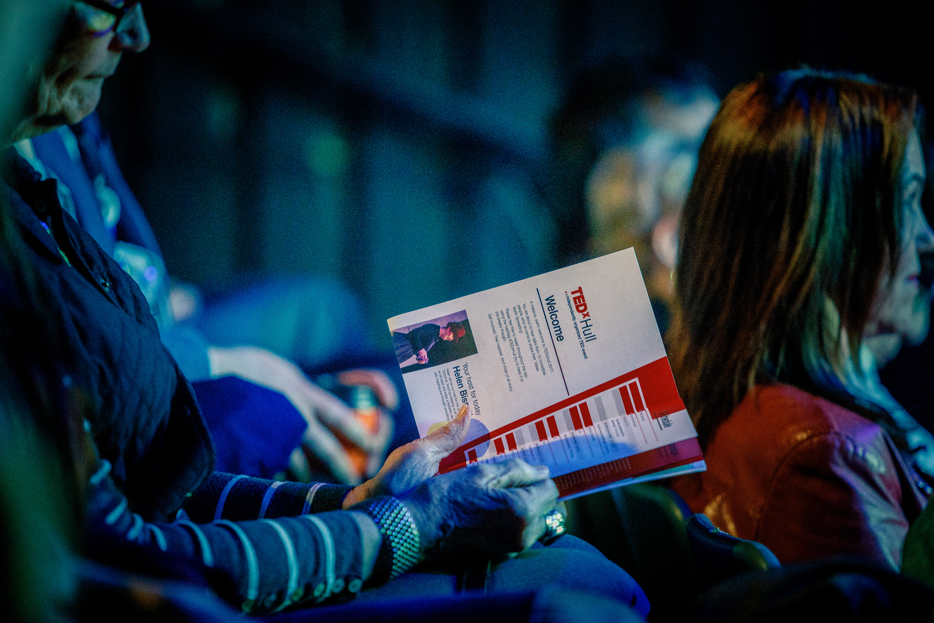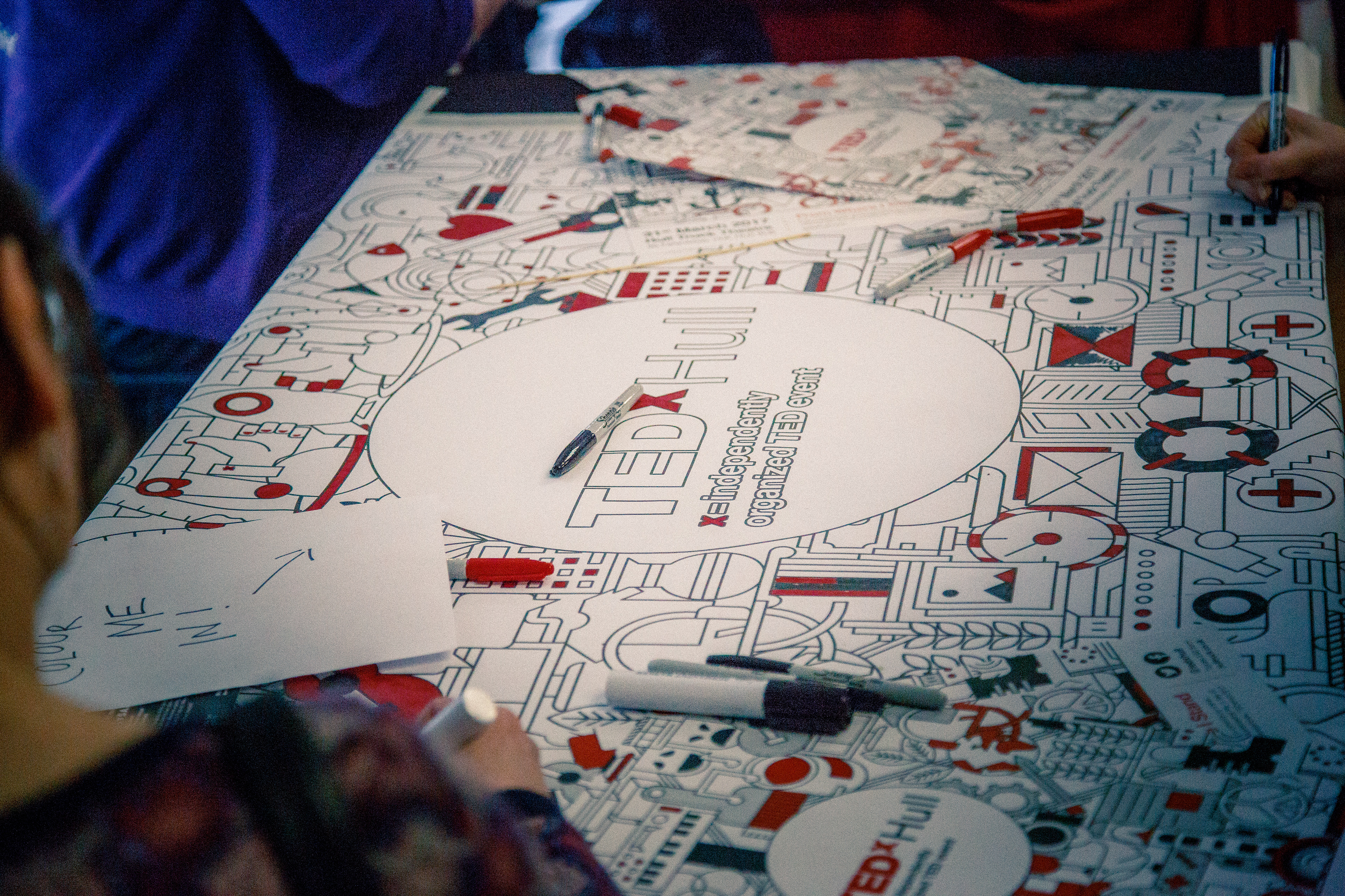 Design for the 2017 TEDxHull event, including illustrated poster, programme, PPT slides and a giant colouring in sheet of the artwork. Photographs by Mark Kensett Photography.